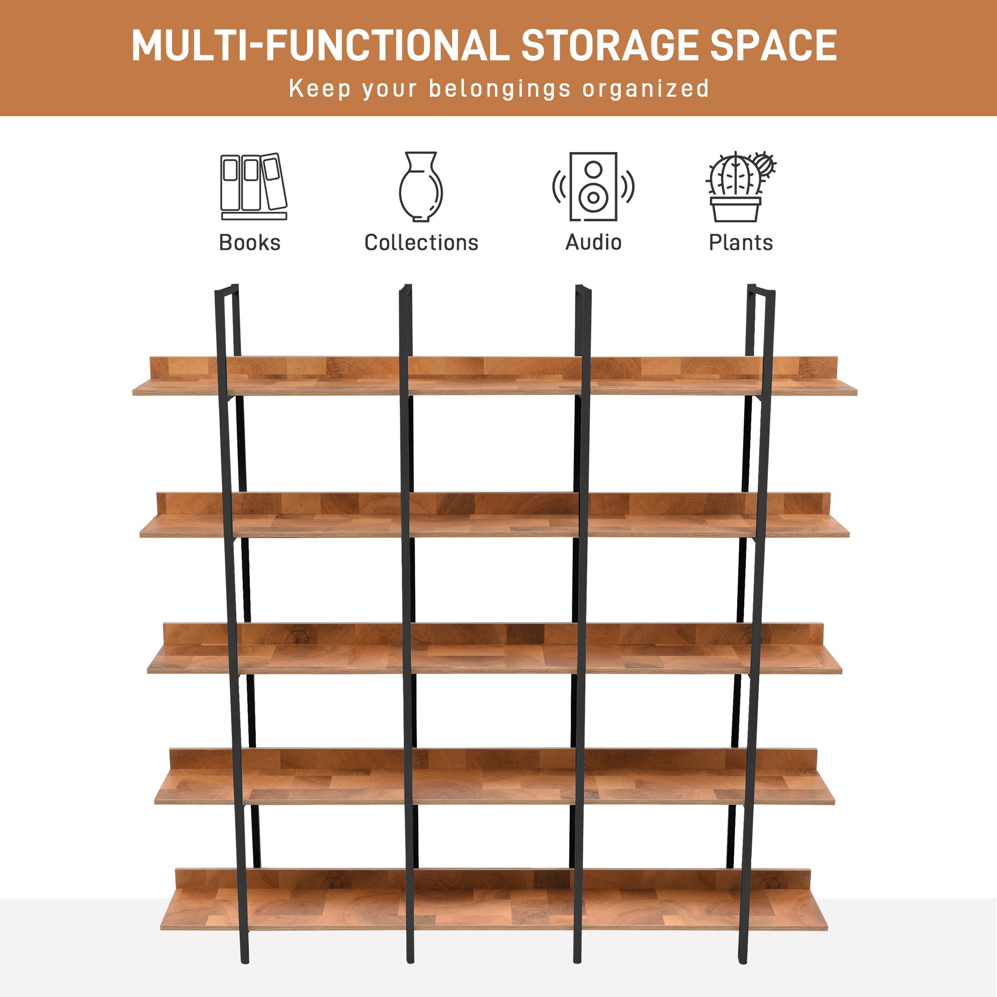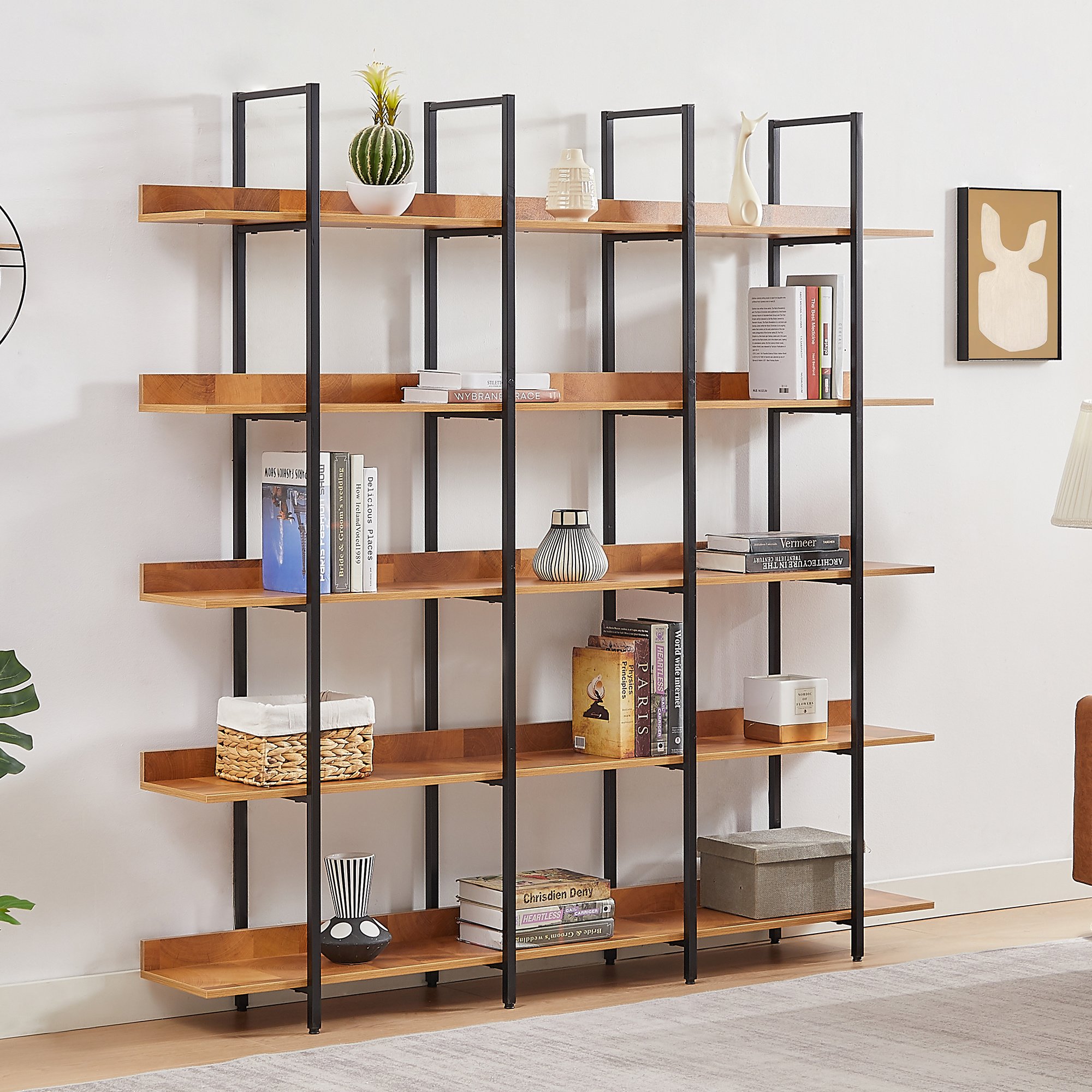 [Five-tier Shelf Storage] The open design of this bookcase combines the charm of both minimalist and vintage furniture styles. each designed with upright panels to stop things falling off and provides plenty of space to display and storage your books, decorations, plants, and other daily accessories.