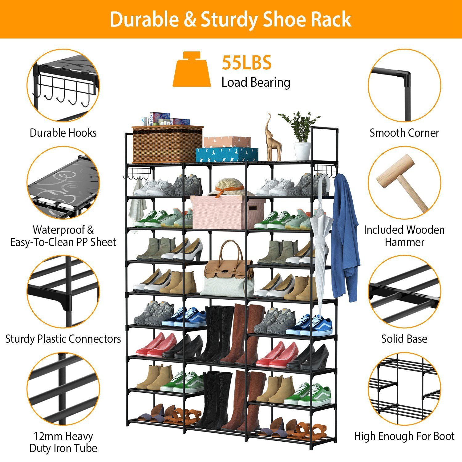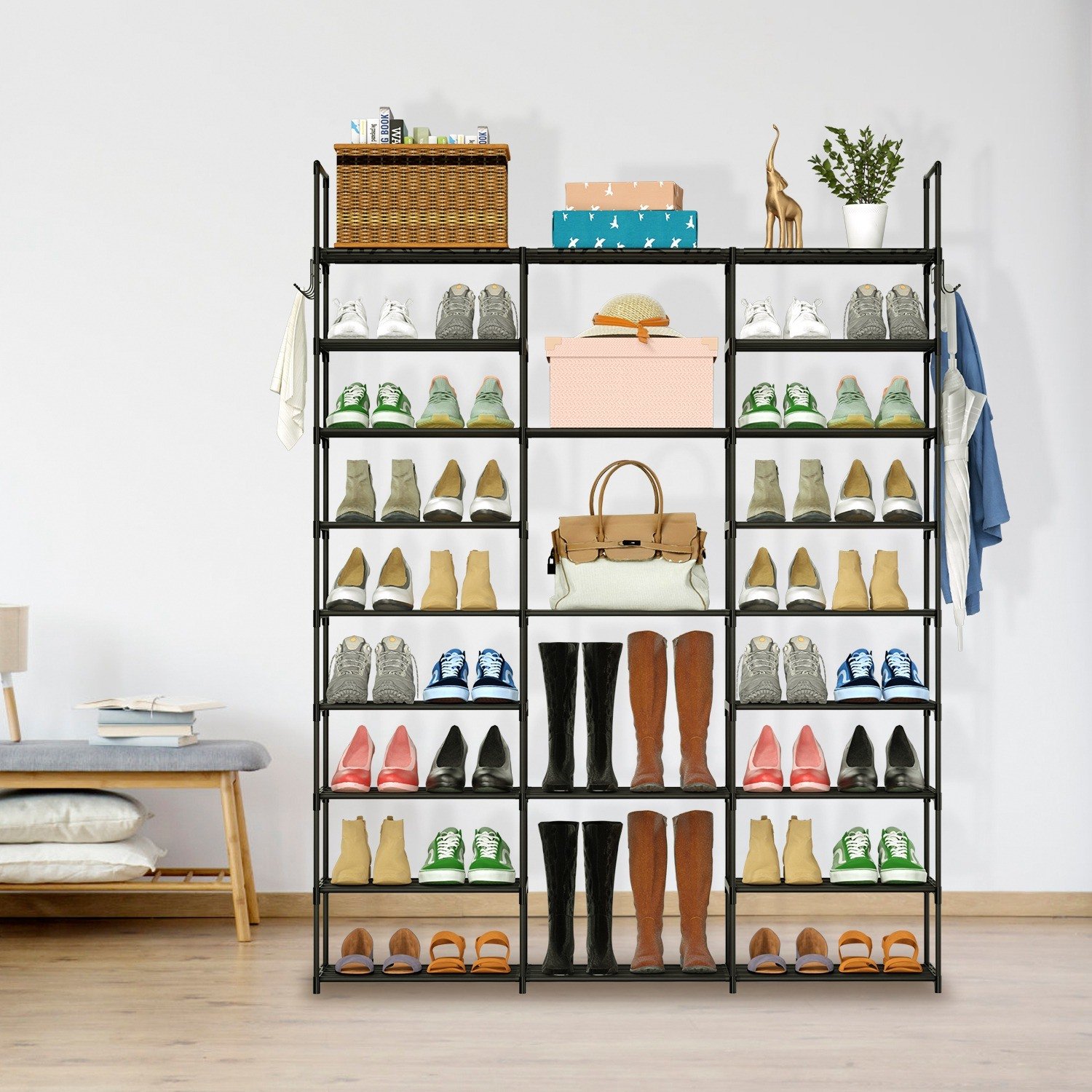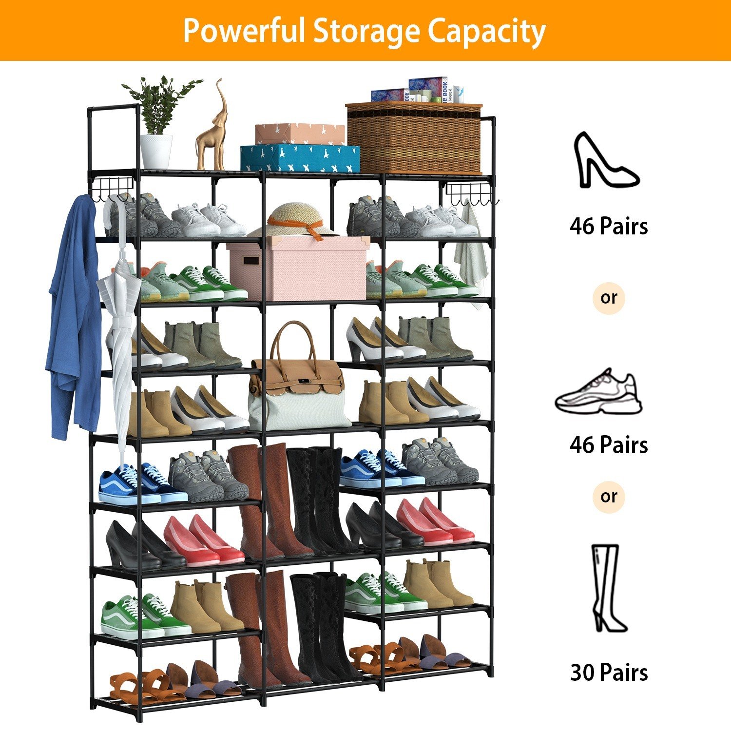 *9-Tier 3-Row Shoe Rack*:With 9 tiers on two side rows and 5 tiers on the middle row; the shoe organizer shelf is 49.6x62.2x10.8in; which can store about 50 pairs of shoes of different heights like boots; high heels or slippers. Comes with 2 hooks which can hang your bags; ties; keys; purses; earrings; belts; scarves; etc.. 3Pcs PP sheets can be placed on the top to hold some toys; books; hats and other small items.