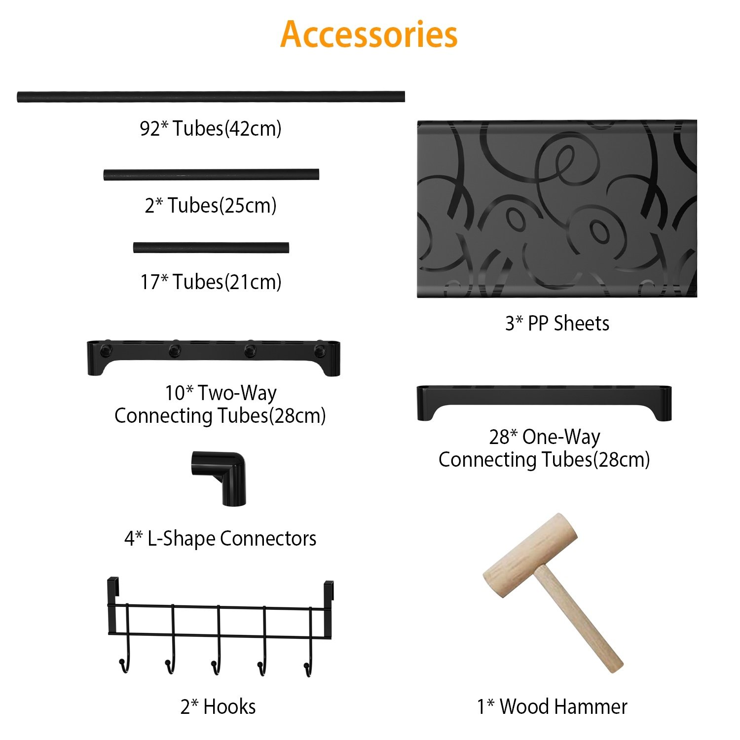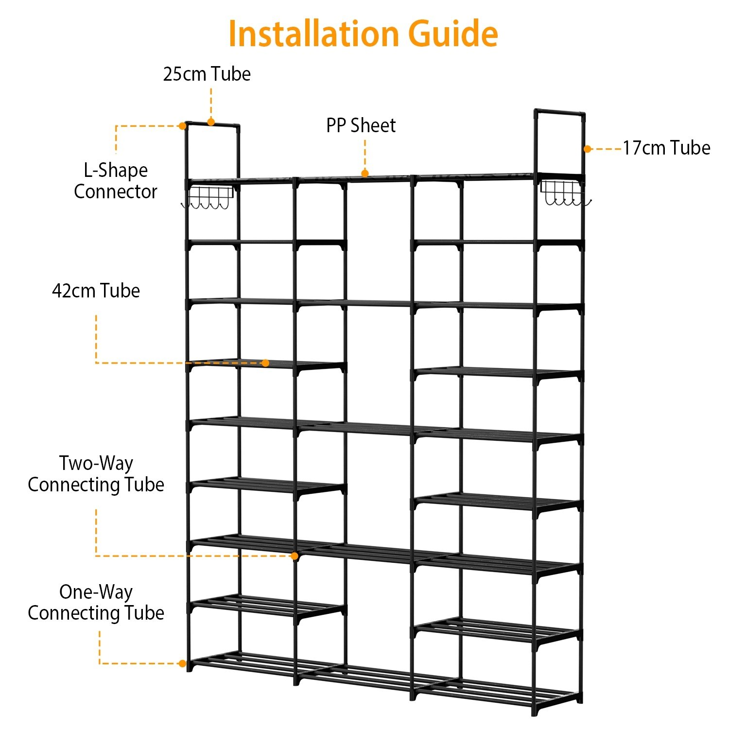 *Easy To Assemble*:Come with complete accessories including iron tubes; plastic connectors; hooks; PP sheets and a wood hammer; easy to install with a few simple steps. User manual is included to help you assemble the shoe rack quickly and easily.