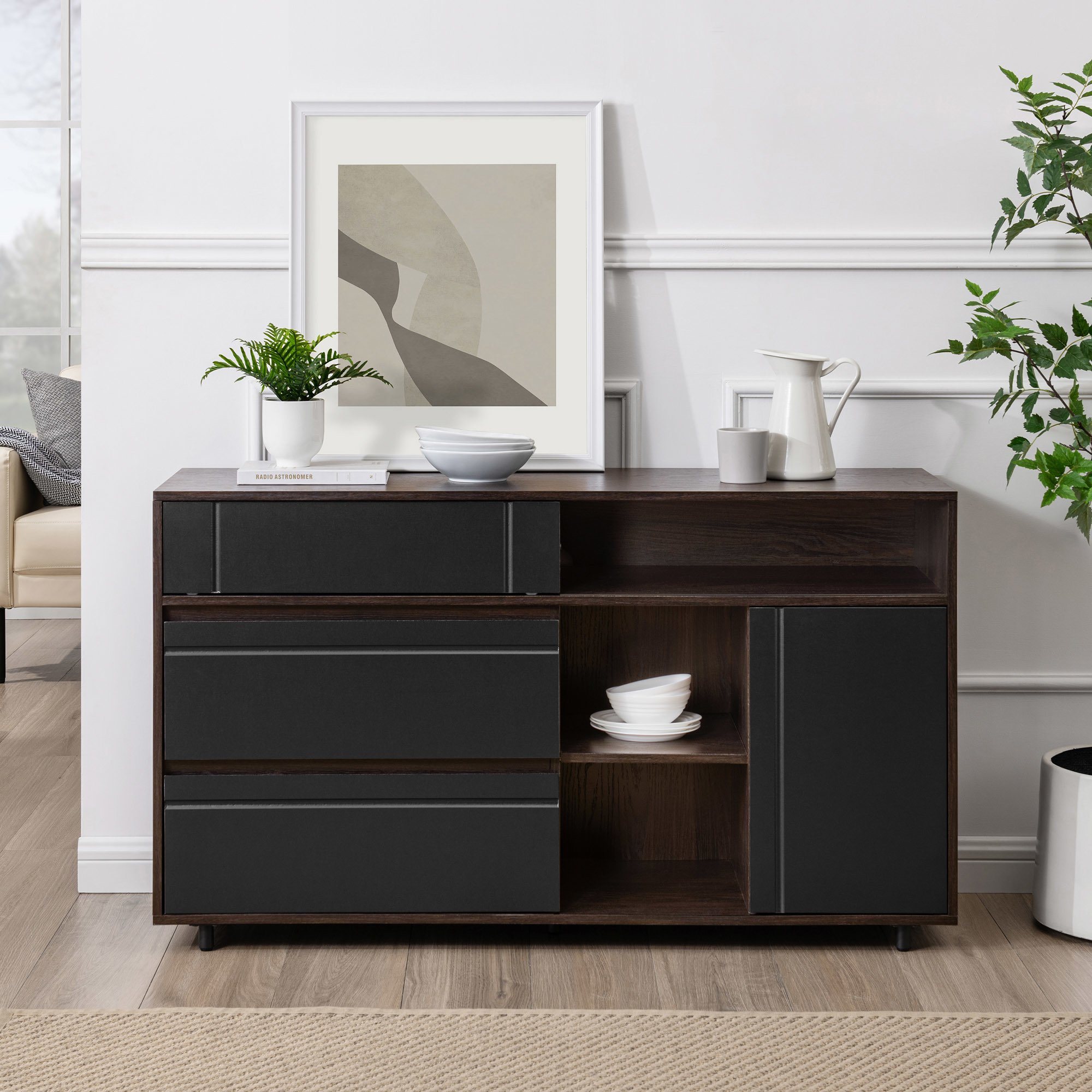 Contemporary Detailed-Door Sideboard with Open Storage – Dark Espresso / Solid Black