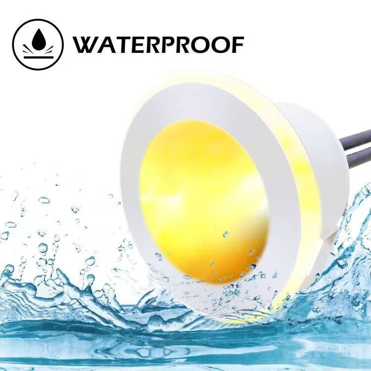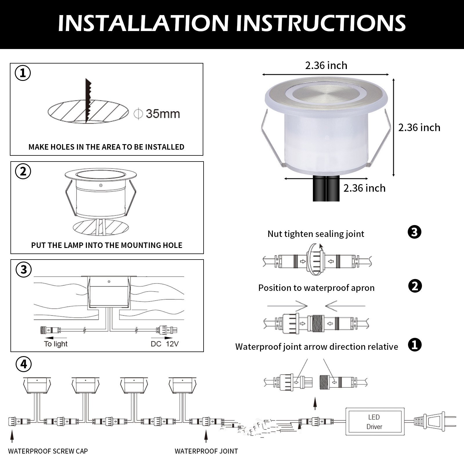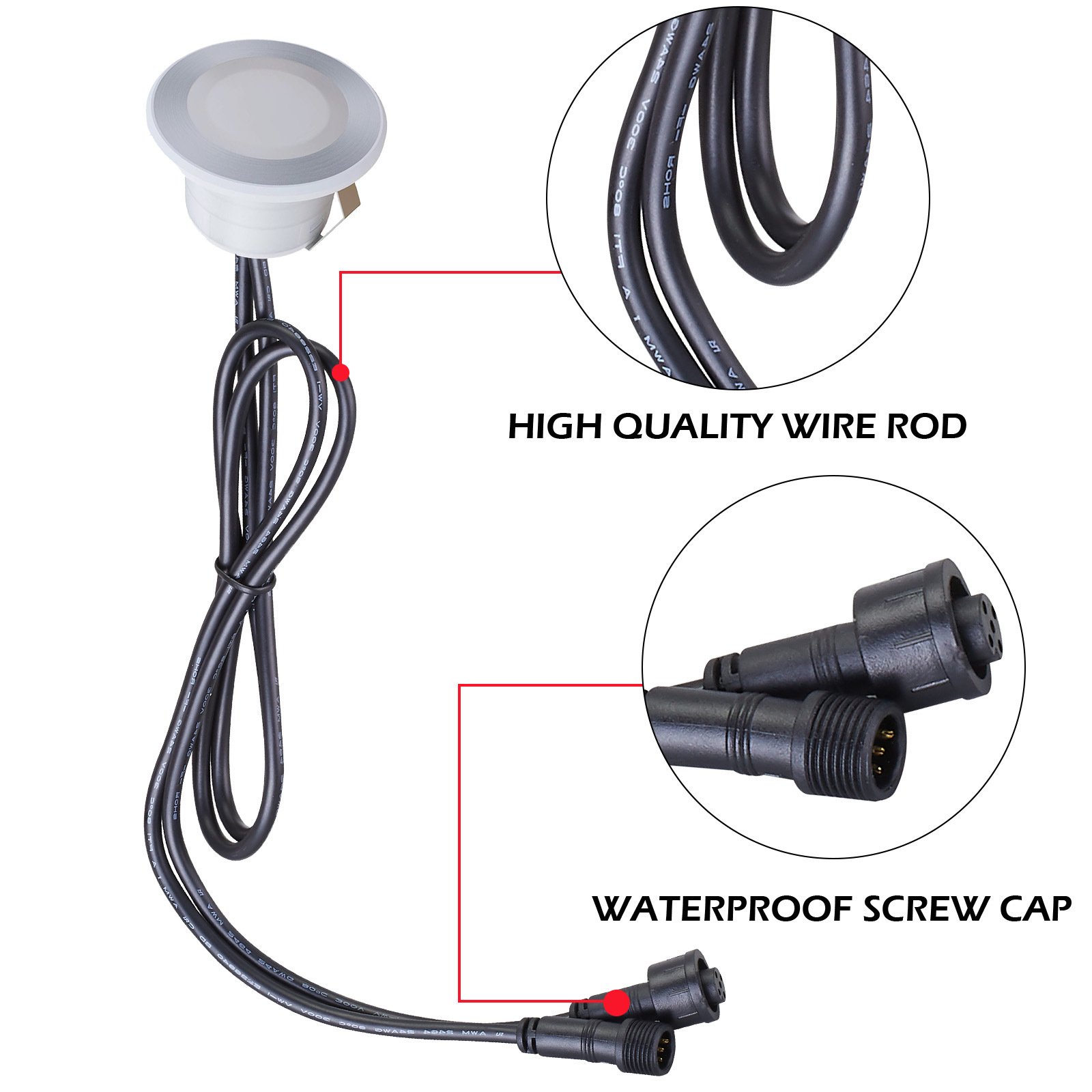 3.Simple to install &convenient to use. Drill holes, push led deck lights in, connect cables.Cut out size for hole is Φ1.38"(35mm),no need for embedded part. Waterproof plugs could be linkable between 2 deck lights ,length of 2 deck lights is 2.86ft(1m),10 deck light is 28.5ft(10m).Use the remote control or App on the mobile phone to control .