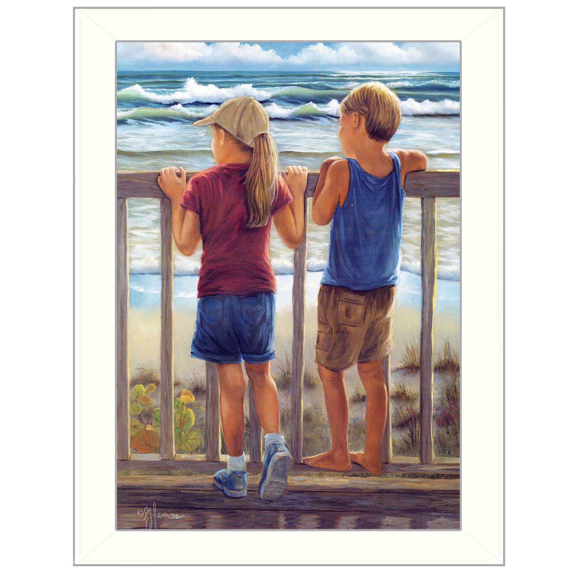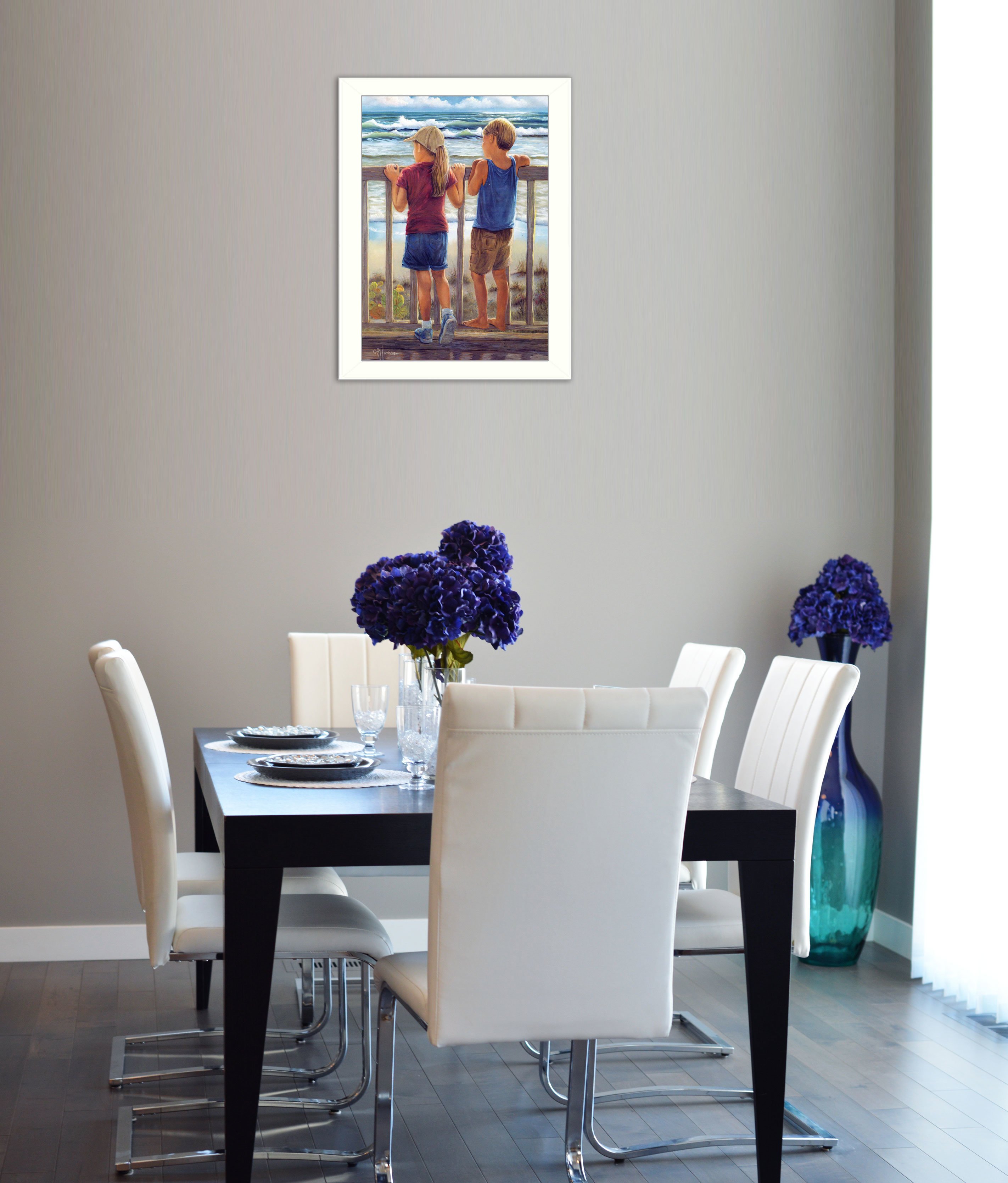 "Looking Over the Rail" is a 10" x 14" framed print. This artwork features to children looking over the rail at the ocean by artist Georgia Janisse. This totally American Made wall decor item features an attractive frame, a textured canvas like finish so no glass is necessary and is ready to hang. •Women Owned (WBE)•Textured Artwork with a 'rolled on' acid free acrylic coating to create a canvas painting effect. No glass is necessary.•UV protectant coating protects artwork from fading.•MDF moulding adds natural beauty to the framed art. Frame is keyholed for ease of hanging.