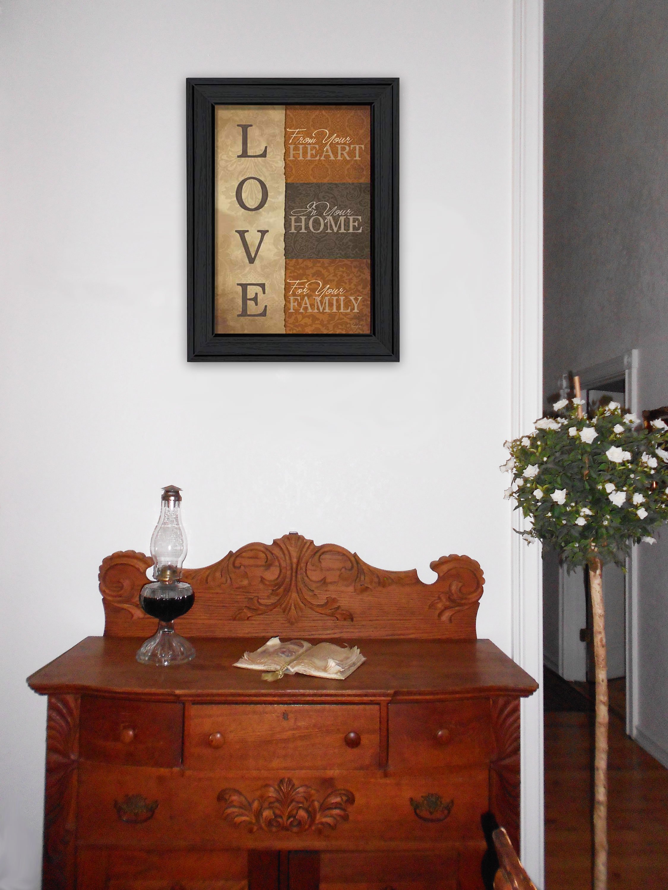"Love" is a 15"x 19" black framed inspirational art print. This artwork features script, by Lauren Rader, about Love for your family. This totally American Made wall decor item features an decorative black frame. The framed art print has a protective, archival finish (glass is not needed) and arrives ready to hang.•Women Owned (WBE)•Textured Artwork with a 'rolled on' acid free acrylic coating to create a canvas painting effect. No glass is necessary.•UV protectant coating protects artwork from fading.•Arrives Ready to Hang