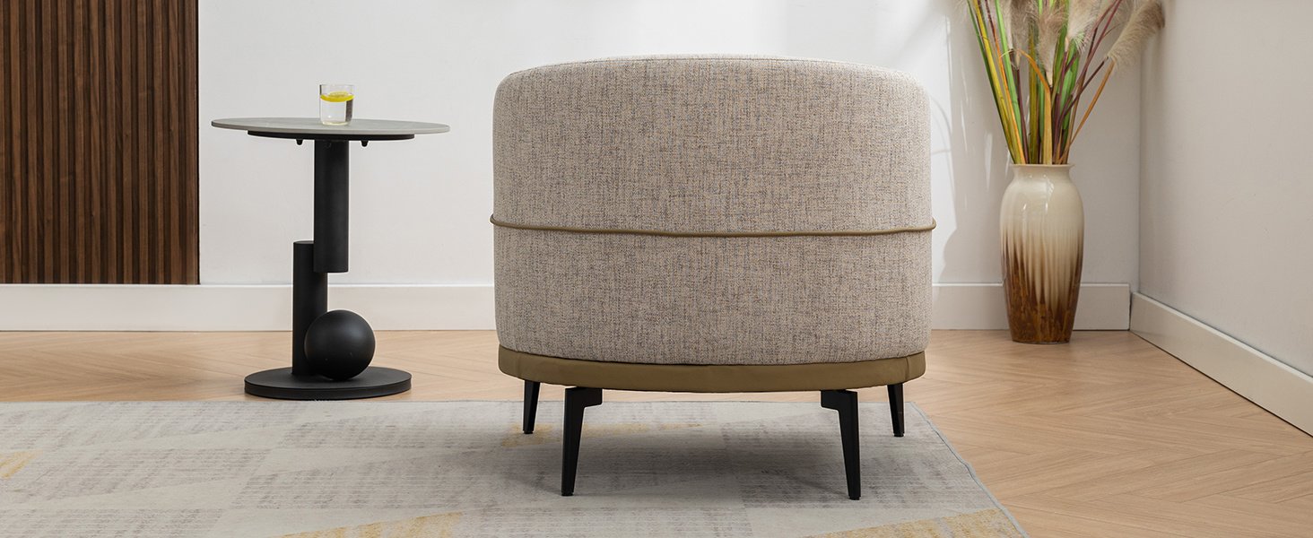 This two-tone barrel chair with the combination of linen and PU leather will surely update your room with style. This chair is a statement of being bold, modern and chic. Decorative PU leather stitching adds delicate details. Four exquisite metal legs provide solid support. Screw-in floor protectors are used for the legs, which not only protectors your floor but also add minor height flexibility. Thick cushions provide added support and comfort.