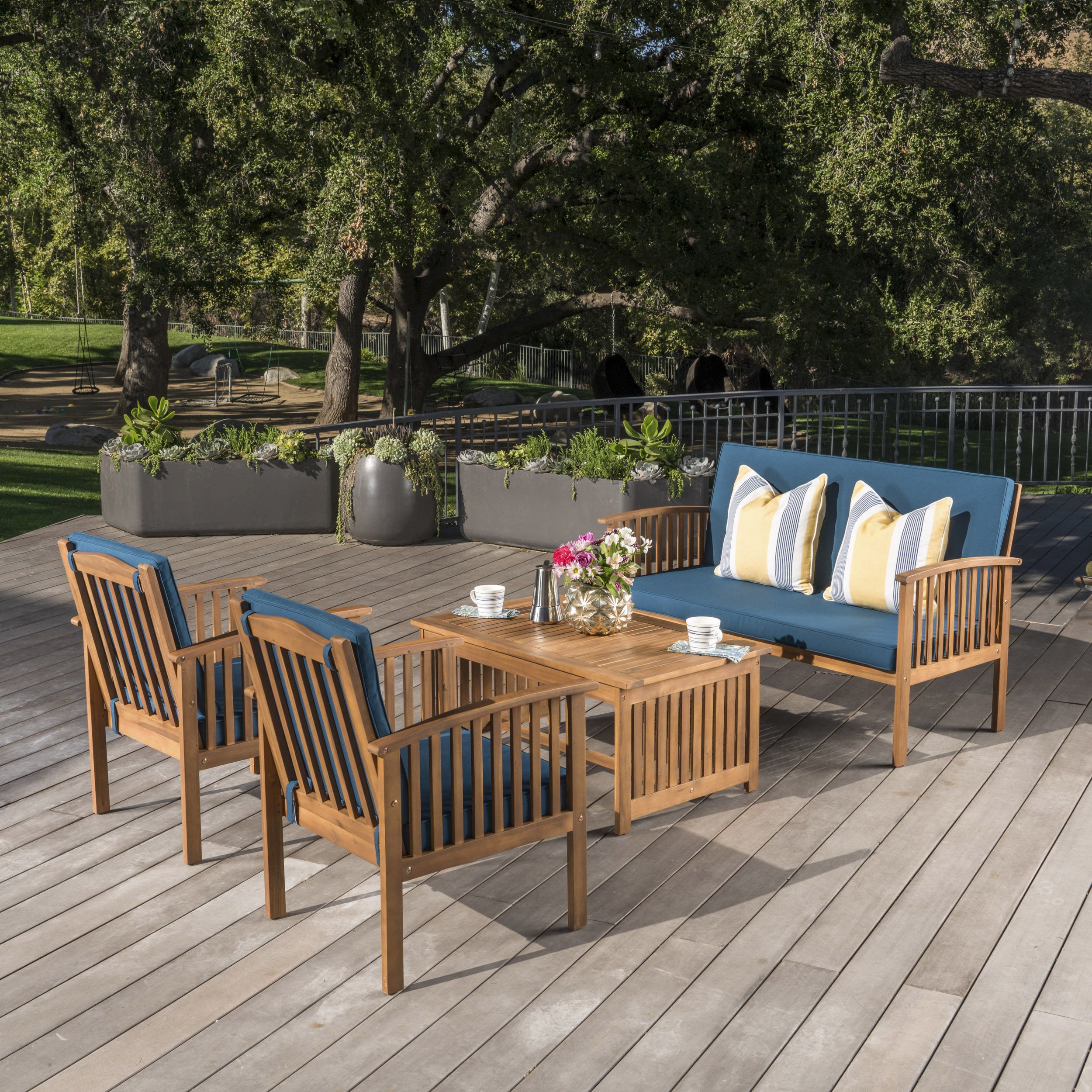 Soak in the vitamin D and bask in the warmth of the sun as you relax on this lovely outdoor chat set. This brilliant set features durable acacia wood frames for a coordinated, nature-inspired look. Water-resistant cushions give the two club chairs and matching sofa a cozy feel, and the open-slatted panel design is a timeless feature. Completed with a coffee table, this four-seater set is effortless and lovely. Relax on your patio with your favorite people from the comfort of this stylish collection.