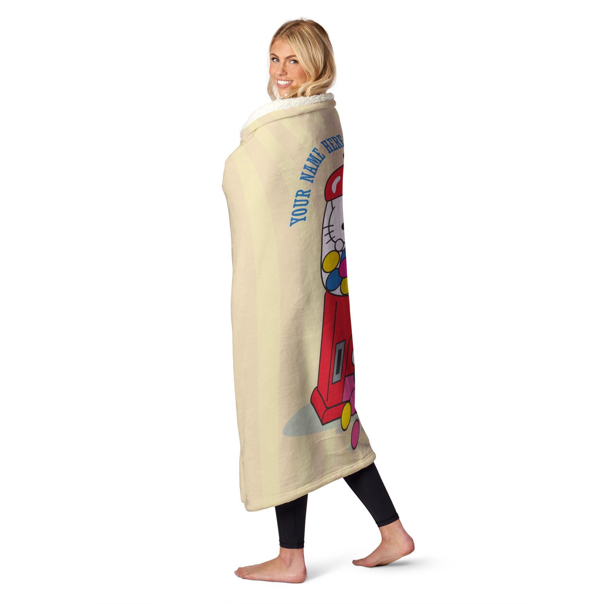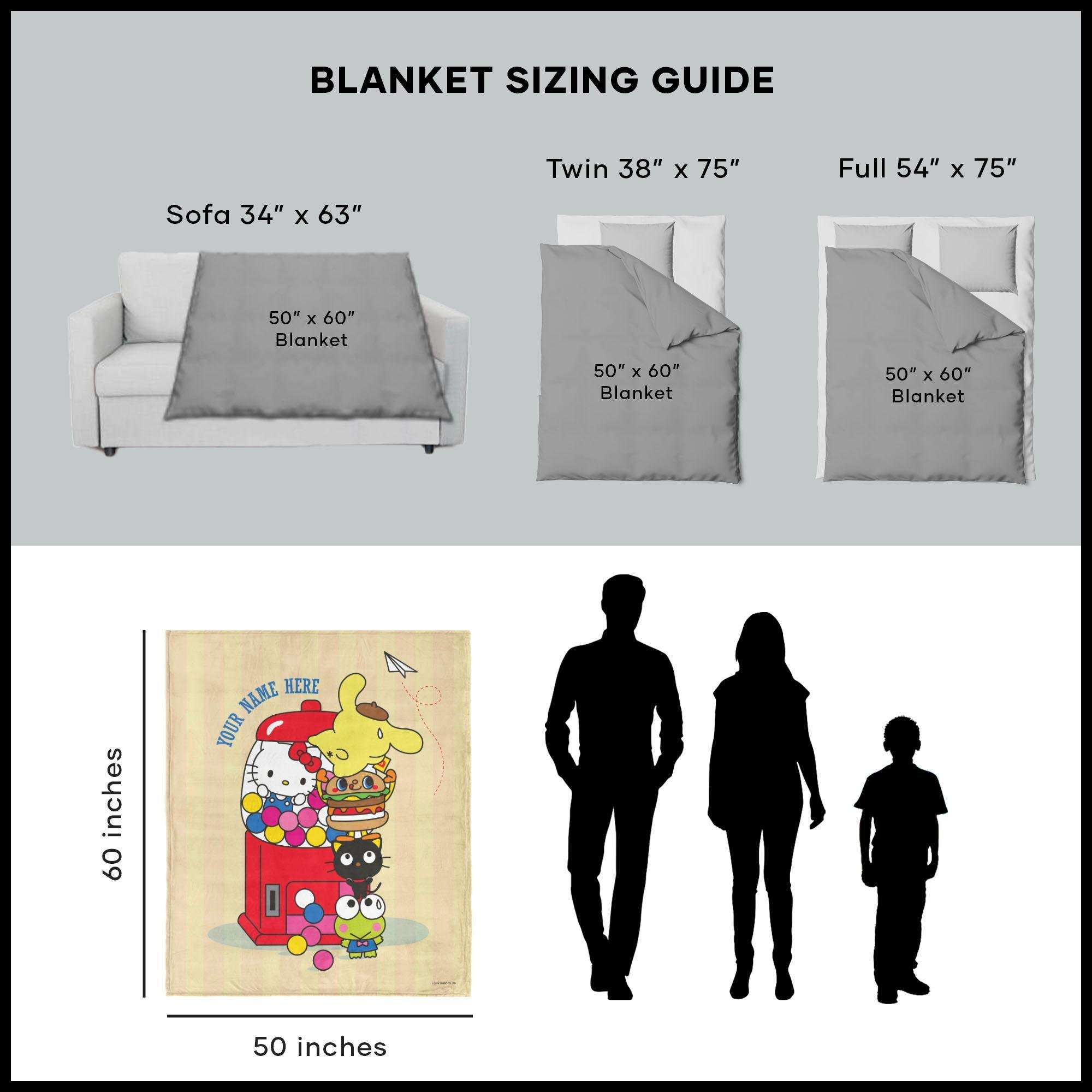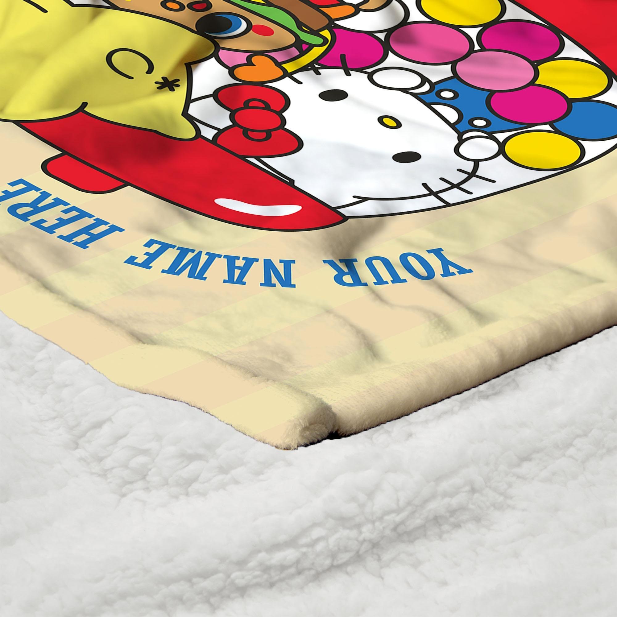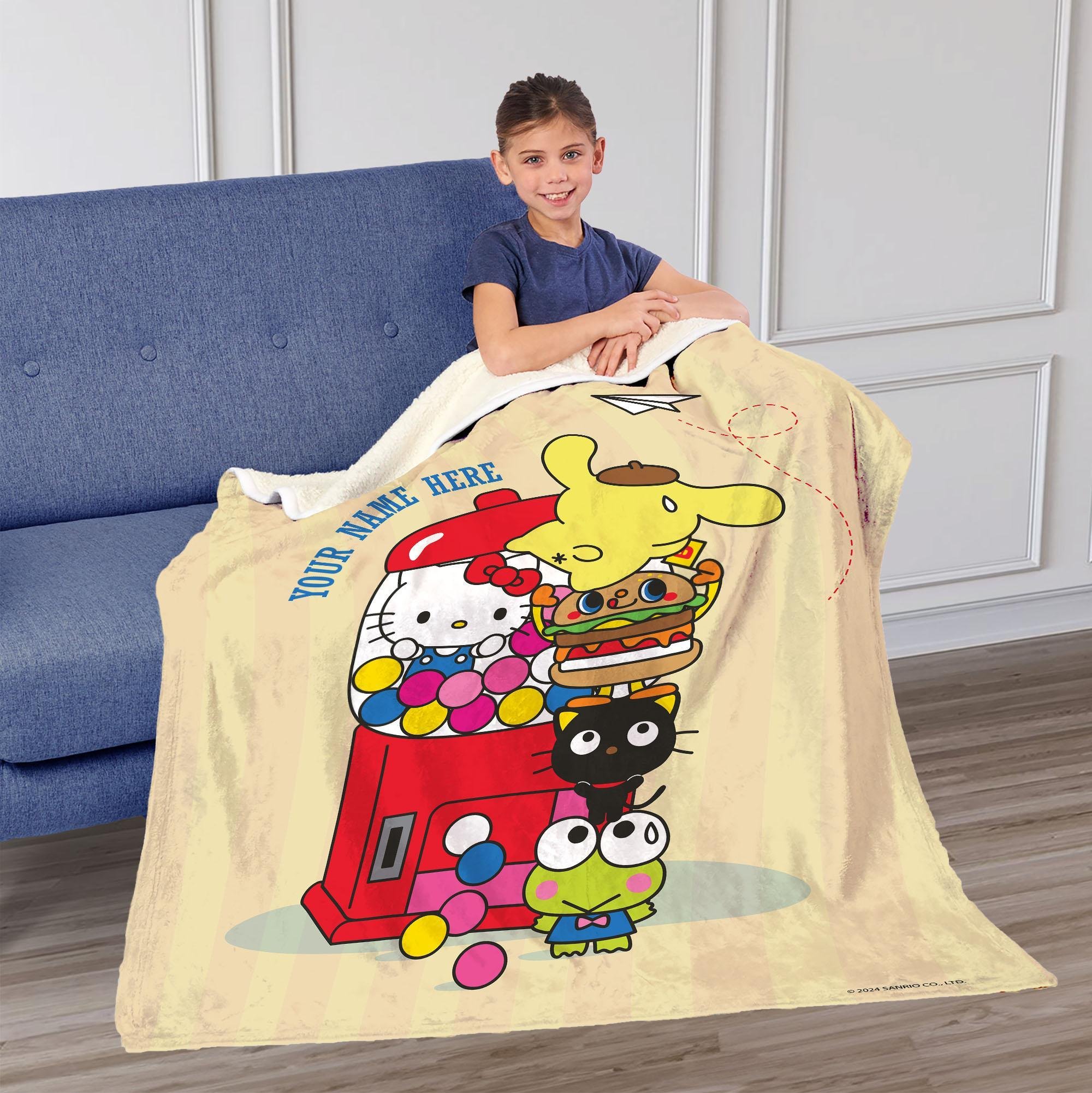Dive into a world of sweetness with the Sanrio Hello Kitty & Friends "Gumball Fun" Personalized Silk Touch Sherpa Throw! This throw is a cozy haven of comfort, offering a soft touch that's perfect for snuggling up on chilly days. Hello Kitty takes center stage inside a vibrant gumball machine, adding a playful touch to your space. In front of the machine, a tower of her best friends adds to the charm, creating a scene that's bursting with joy and friendship. Add your own personalization to this delightful design, making it uniquely yours.