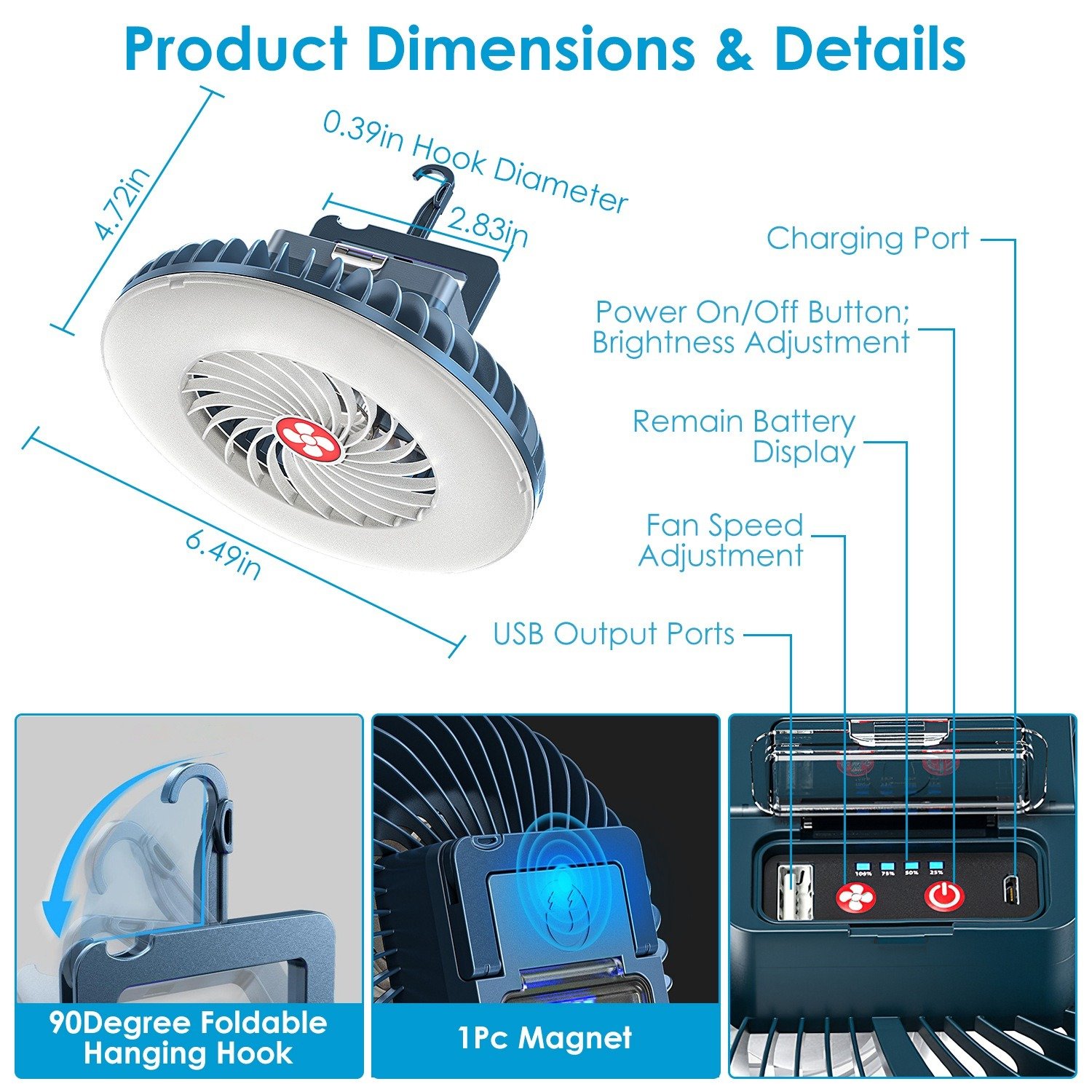 **Hanging Fan Lamp*:Come with 90 degree foldable hook design and 1 Pc magnet on the back; hang in your tents; cars; branches; walls; and etc.. It works great for 2-4 person camping tents or ice fishing shelters when attached on the ceiling with its IPX4 waterproof performance. Lightweight and easy to carry.