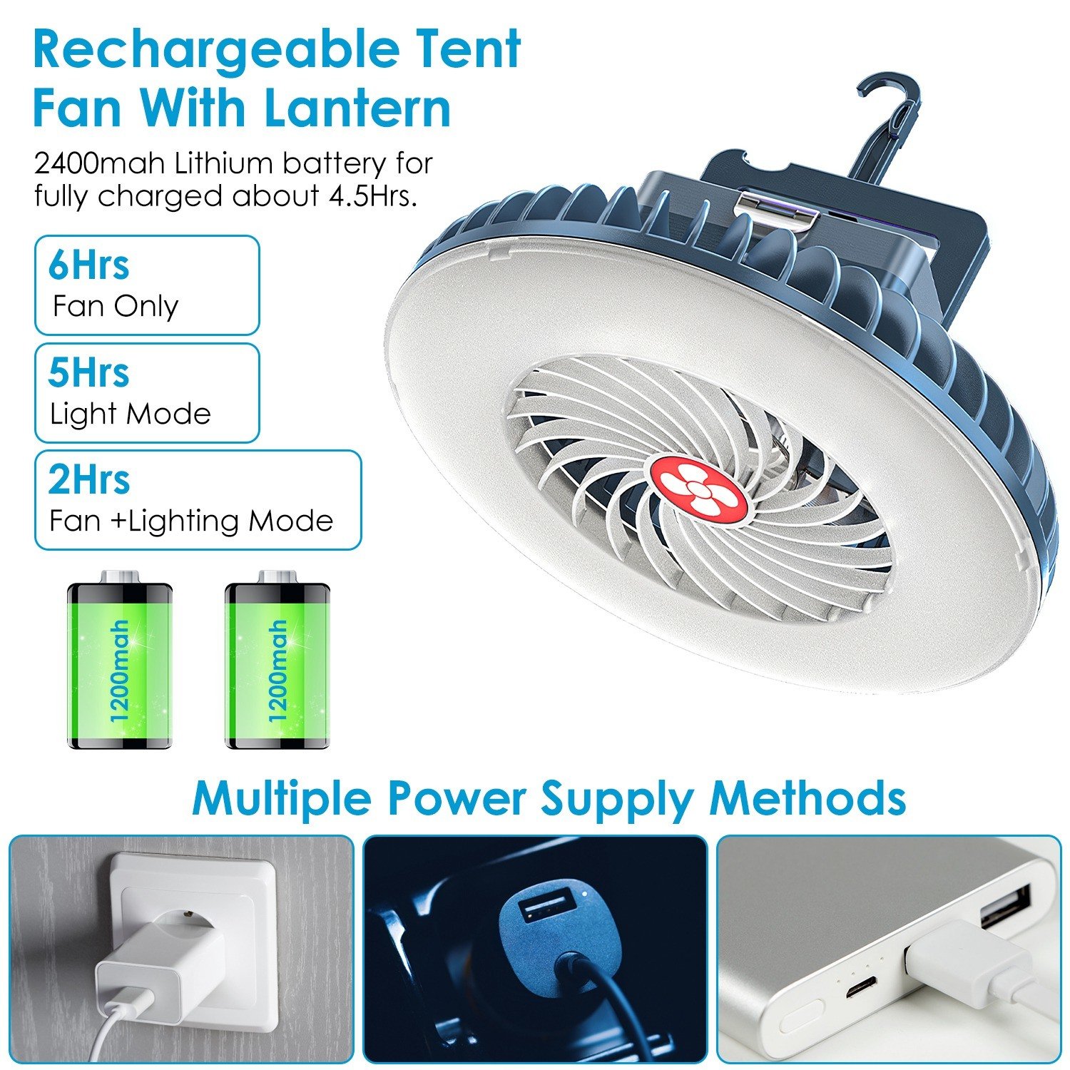 **3 Fan Speeds*:Inbuilt with 2Pcs lithium battery; overall 2400mah; tent ceiling fan can work continuously for 6 hours according to the fans speed and setting. Deliver strong wind; natural wind and low speed wind for camping; hiking; adventure; outdoor work; car repair; office; bedroom; survival kit. 4 Indicators can clearly see the remaining power and remind you to charge in time; no sudden dead battery situation.