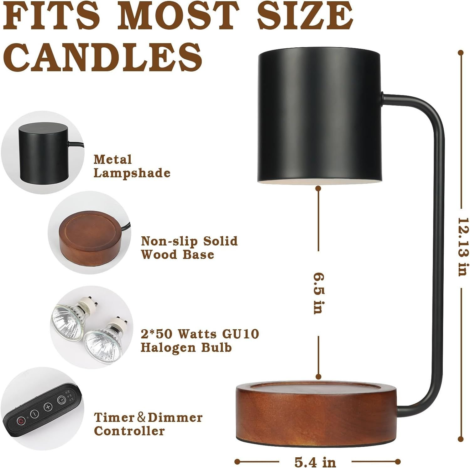 [Timer&Dimmable Controller]This candle warming lamp with timer is dimmable and has 2/4/8 hours shut-off function. It is easy to use and the candle wax will be evenly melts in minutes. There is four dimming settings for meets different ambiance needs. The brighter you set, the faster candles melts. The wood base is large enough to hold large candle or different sizes candles. And the post is height adjustable for most sizes of candle.