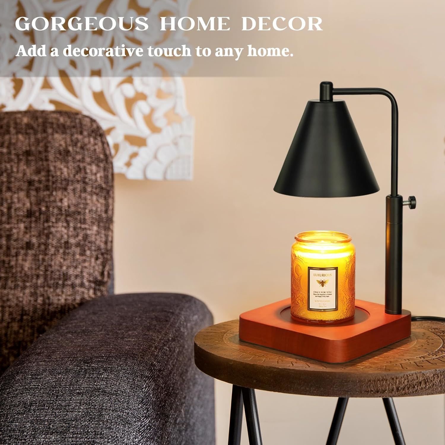 [Timer&Dimmable Controller]This candle warming lamp with timer is dimmable and has 2/4/8 hours shut-off function. It is easy to use and the candle wax will be evenly melts in minutes. There is four dimming settings for meets different ambiance needs. The brighter you set, the faster candles melts. The wood base is large enough to hold large candle or different sizes candles. And the post is height adjustable for most sizes of candle.