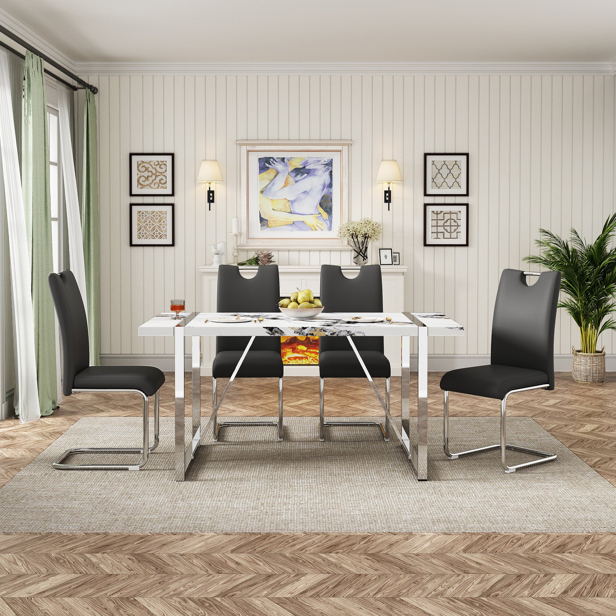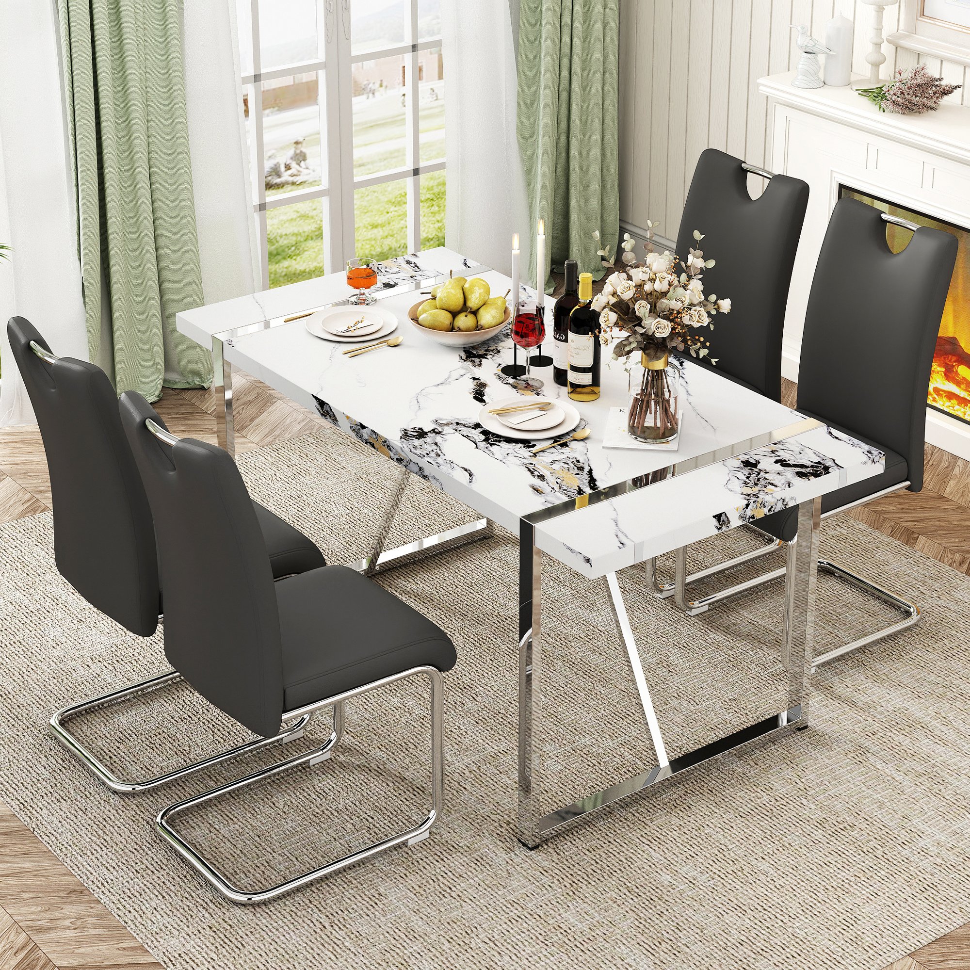 1.Are you looking for a dining table set? If so, this 1.8" Thick MDF Faux marble dining table set with 4 pieces chairs is highly recommended to you. Whether you want to enjoy dinner with your family at the dining table or gather with friends, this table will satisfy you. Great for the dining room, kitchen and living room, anywhere you want to put it.