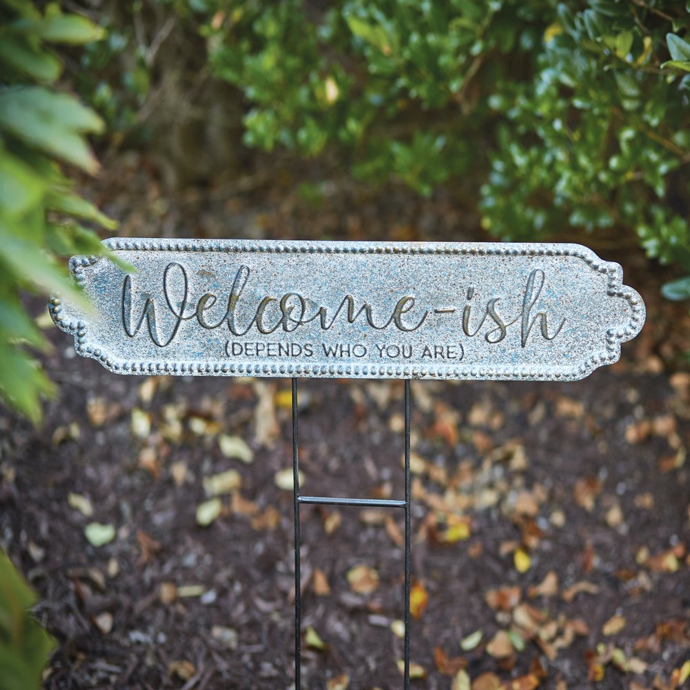 Featuring the phrase ''Welcome-ish… Depends who you are,'' this garden stake will be sure to capture many laughs. It’s the perfect sign for introverts, homebodies, and people who love a good chuckle. This item is crafted from metal.