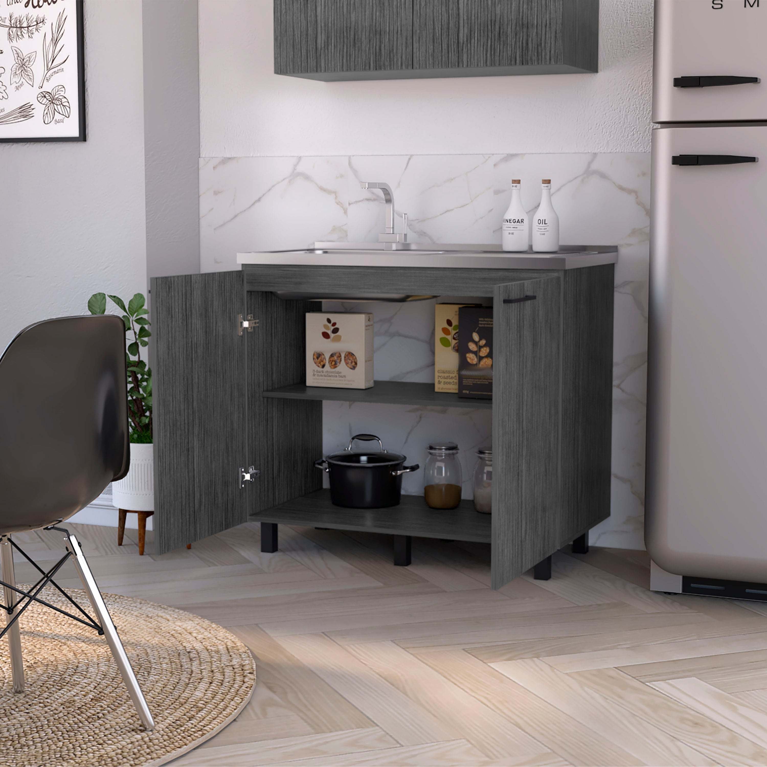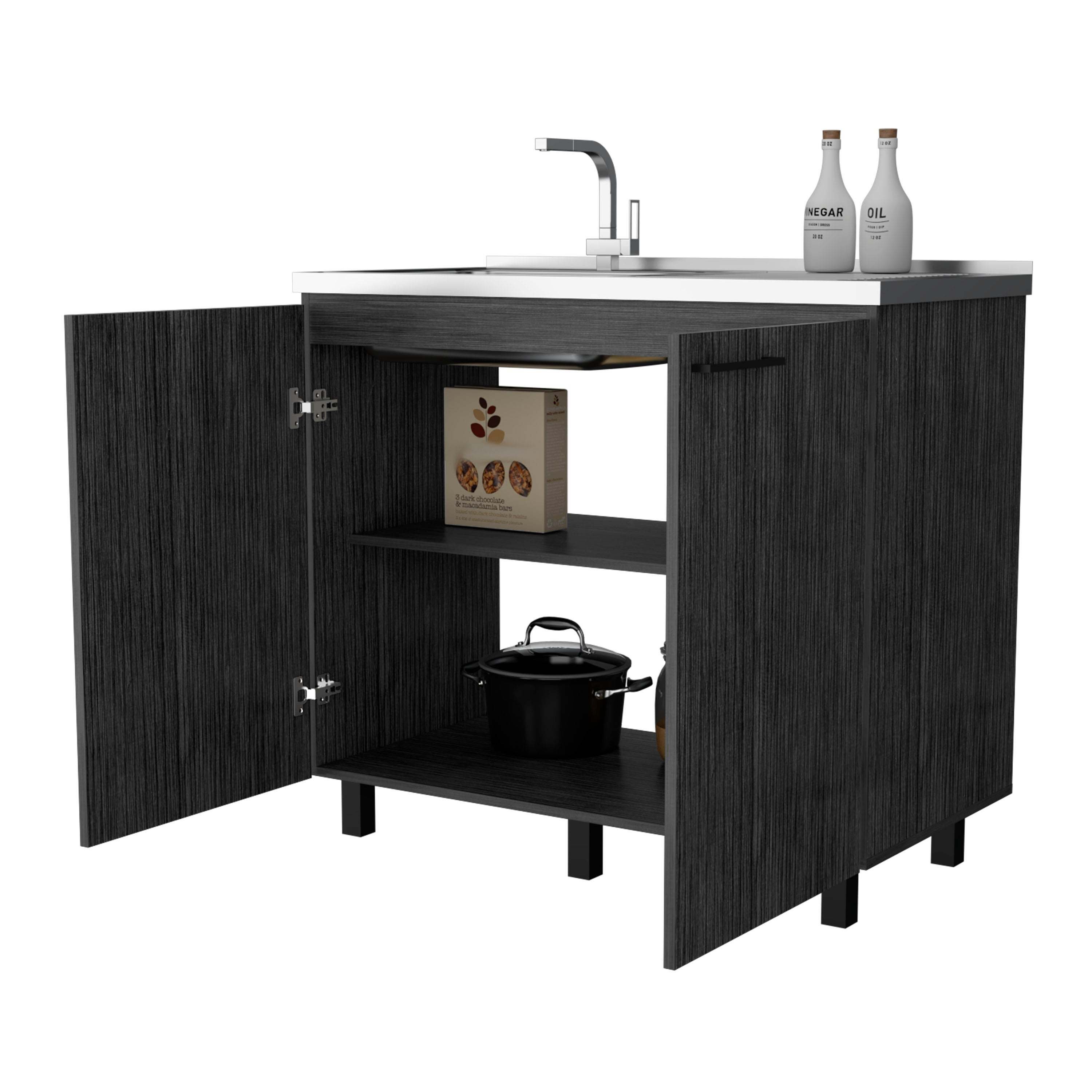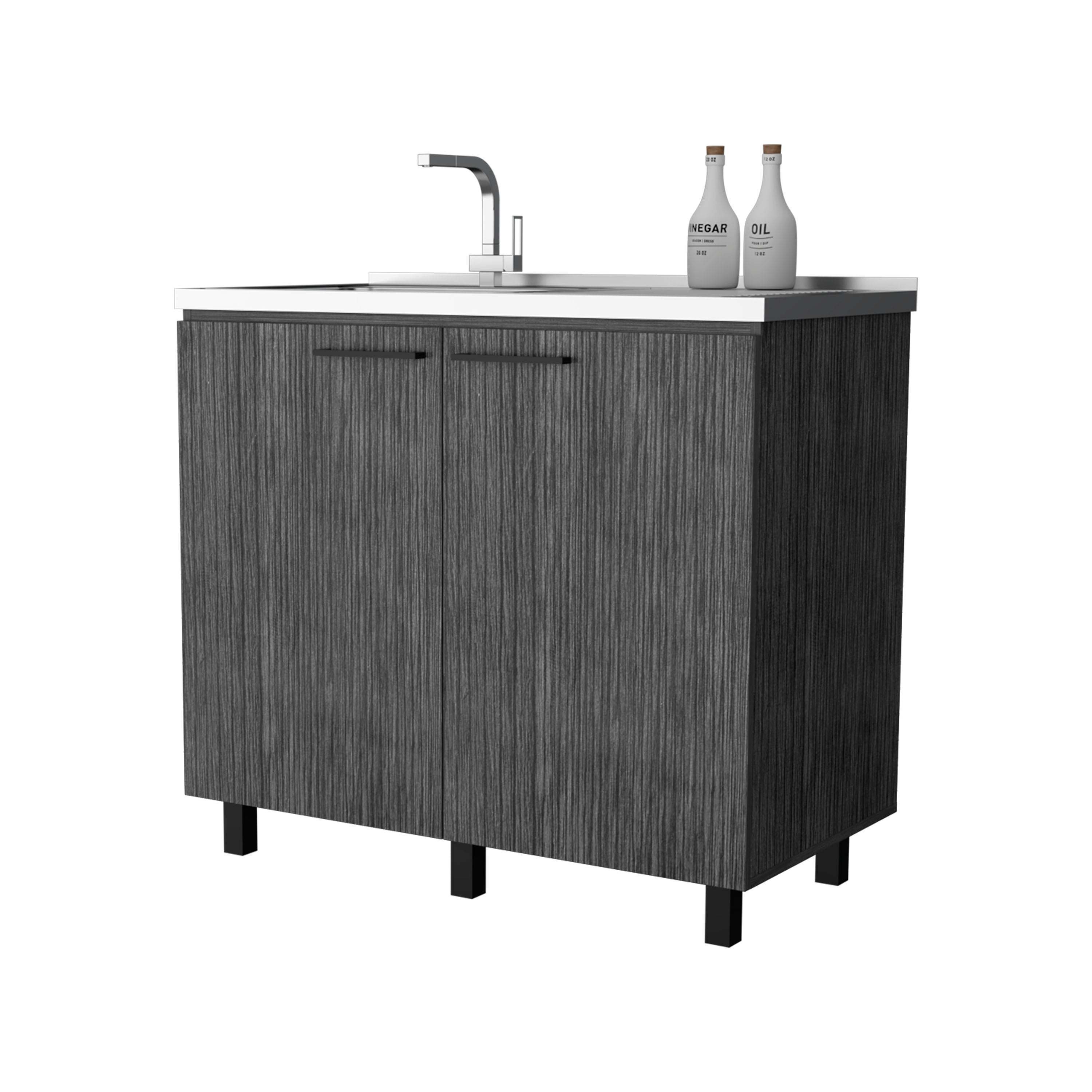 Upgrade your kitchen with 2 utility sink and cabinet, offering extra counter space and durability that lasts for years. Featuring a large countertop area made of exclusive heavy-duty aluminum, stylish slender legs for a unique touch, two large doors, and a shelf for internal storage, this cabinet is perfect for renovations or extra storage needs.