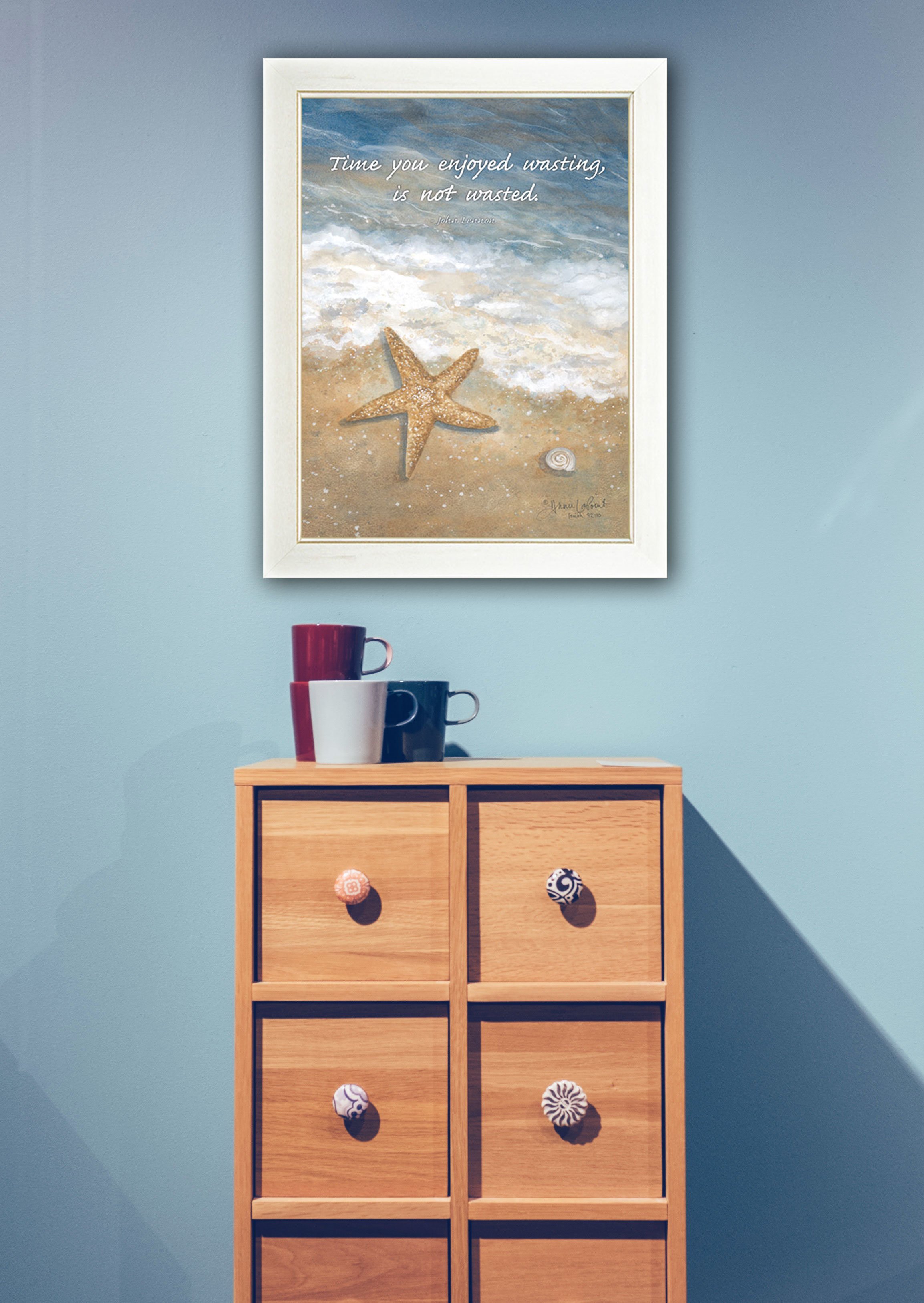 "Time Wasted" is a 10"x 14" framed print by artist Annie LaPointe. This artwork features a water scene with a starfish and the words time you enjoyed wasting is not wasted. This totally American Made wall decor item features an attractive frame, a textured canvas like finish so no glass is necessary and is ready to hang. •Women Owned (WBE)•Textured Artwork with a 'rolled on' acid free acrylic coating to create a canvas painting effect. No glass is necessary.•UV protectant coating protects artwork from fading.•MDF moulding adds natural beauty to the framed art. Frame is keyholed for ease of hanging.
