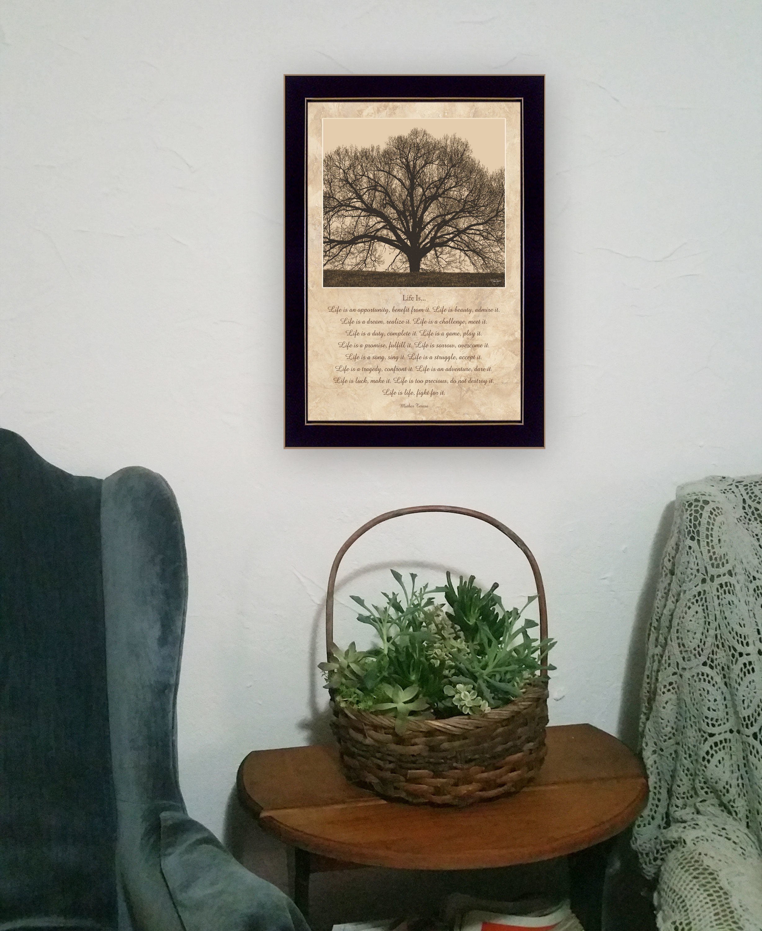 "Life Is" is a 14"x18" black framed inspirational framed art print by artist John Jones. This artwork features a prominent image of a Grand Tree on the top half of the presentation. The bottom portion of the piece presents a verse entitled "Life Is" by the exceptional Mother Theresa. Crafted By Skilled American Crafters And Coated With A Fade-resistant Texture, This Piece Has A Canvas-like Appearance That Will Last For Years To Come. Invest In A Piece That Is Truly One-of-a-kind.•Transform your walls with this stunning piece of art and bring a touch of modern elegance to your room. This stunning piece will not only add visual interest to any room but it's minimalist design will bring a sense of serenity to your space.•Tired of dull, empty walls in your home? We believe that walls should inspire, not bore. That's why we offer a wide range of wall art to suit any space from bedroom and kitchens to office and beyond. Give your walls a facelift with our printed arts and transform your space into a stylish and inviting home.•This framed wall art is hand-crafted in the USA of high-quality wood with the surface of the art coated with a fade-resistant texture which gives it a canvas-like appearance for many years of enjoyment in your home.•Bring a pop of colour and style to any room with our fully assembled and ready-to-hang wall art. With a wide selection of decorative pieces to choose from, you'll easily find the perfect match for your personal taste or to give as a thoughtful gift. Don't miss out on the opportunity to add some unique charm to your space.•Experience the unmatched quality and durability of American-made craftsmanship with this individually hand-crafted wall decoration art. Skilled crafters put their expertise into every piece to ensure it will stand test of time and bless your eyes for years to come.