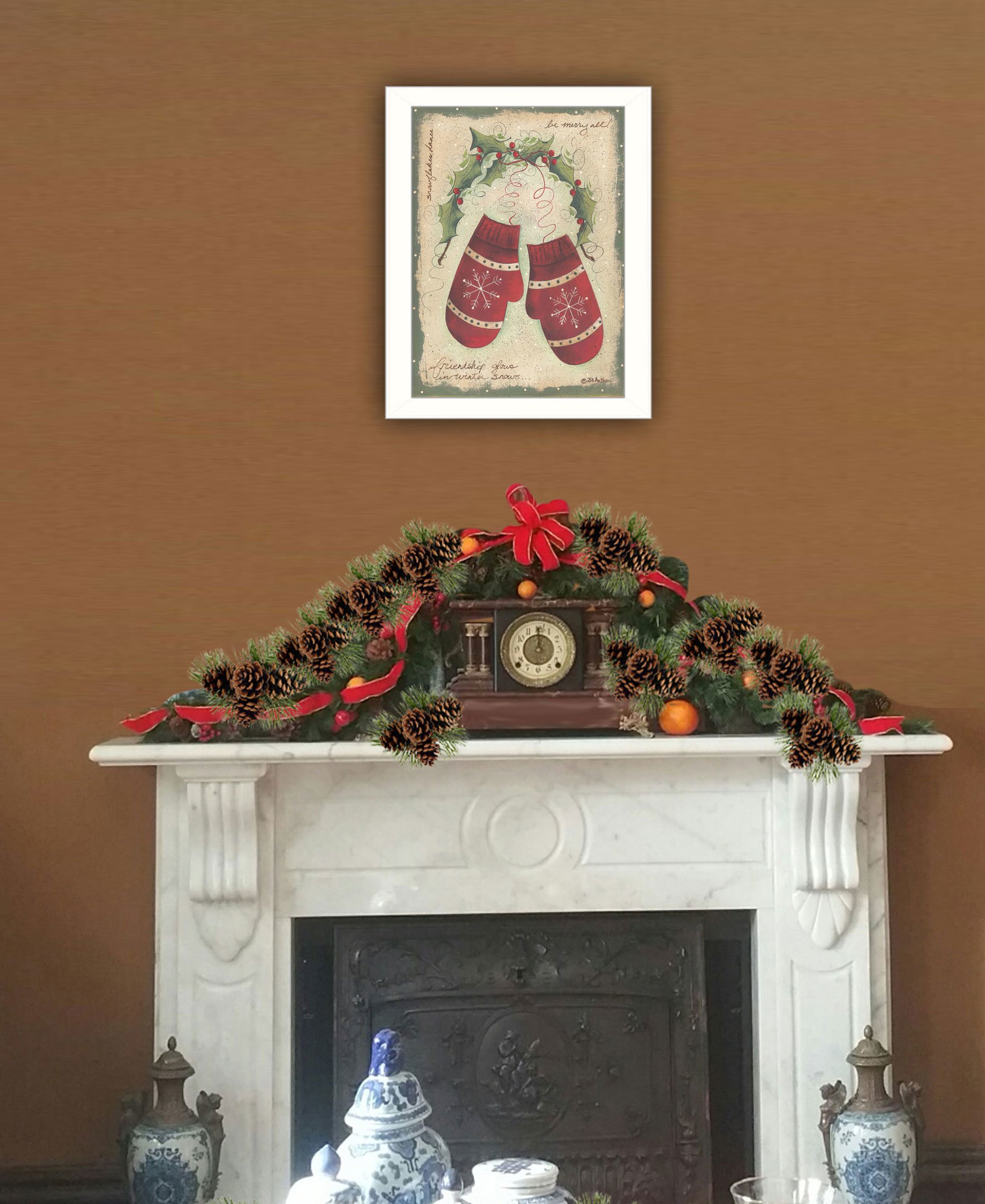 "Merry Mittens" is a 14"x20" framed art print in our white frame of the artwork of Jill Ankrom. It is an artistic rendering of a Christmas mittens with decorative designs on them hanging with holly sprigs and ribbon and Scripted Text 'Friendship glows in winter snows...snowflakes dance...be merry all..' Crafted By Skilled American Crafters And Coated With A Fade-resistant Texture, This Piece Has A Canvas-like Appearance That Will Last For Years To Come. Invest In A Piece That Is Truly One-of-a-kind.•Transform your walls with this stunning piece of art and bring a touch of modern elegance to your room. This stunning piece will not only add visual interest to any room but it's minimalist design will bring a sense of serenity to your space.•Tired of dull, empty walls in your home? We believe that walls should inspire, not bore. That's why we offer a wide range of wall art to suit any space from bedroom and kitchens to office and beyond. Give your walls a facelift with our printed arts and transform your space into a stylish and inviting home.•This framed wall art is hand-crafted in the USA of high-quality wood with the surface of the art coated with a fade-resistant texture which gives it a canvas-like appearance for many years of enjoyment in your home.•Bring a pop of colour and style to any room with our fully assembled and ready-to-hang wall art. With a wide selection of decorative pieces to choose from, you'll easily find the perfect match for your personal taste or to give as a thoughtful gift. Don't miss out on the opportunity to add some unique charm to your space.•Experience the unmatched quality and durability of American-made craftsmanship with this individually hand-crafted wall decoration art. Skilled crafters put their expertise into every piece to ensure it will stand test of time and bless your eyes for years to come.